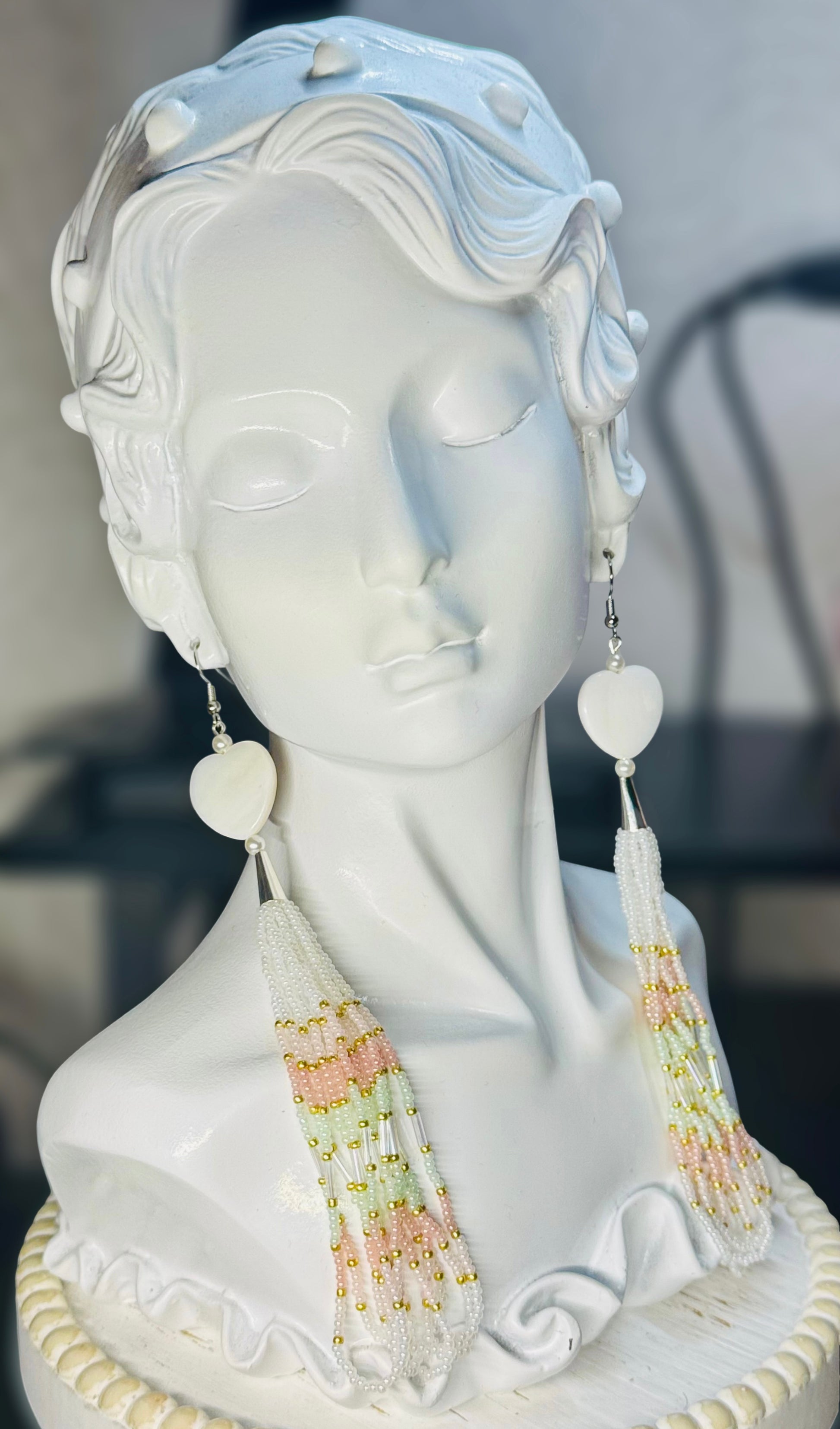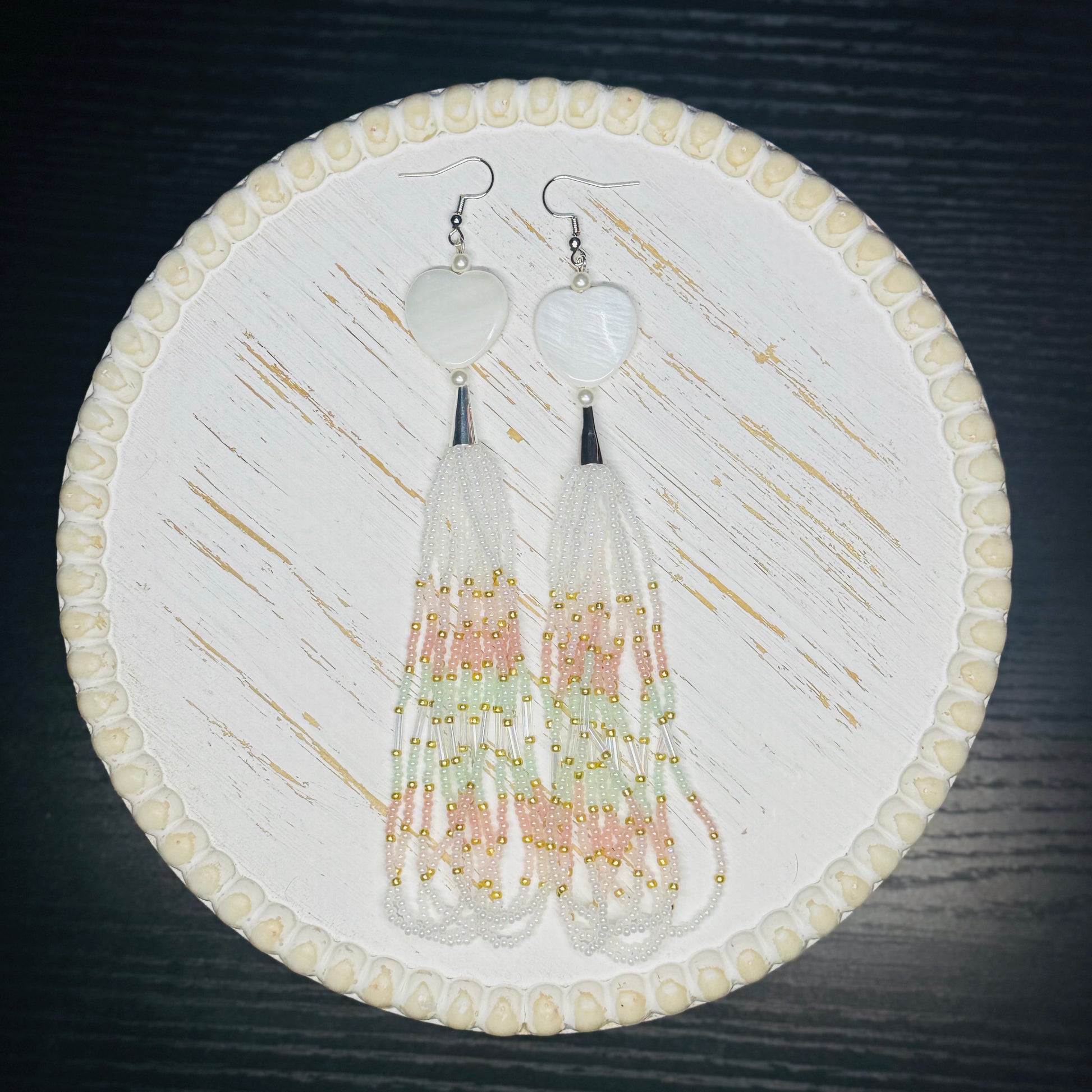 These elegant Spring Blossom Hearts feature delicate beaded fringes, carefully handcrafted with soft pastel hues of pink and green and accented with a touch of gold. Each earring is adorned with a stunning mother-of-pearl heart stone, adding a romantic touch to any outfit. Expertly designed for a timeless look.